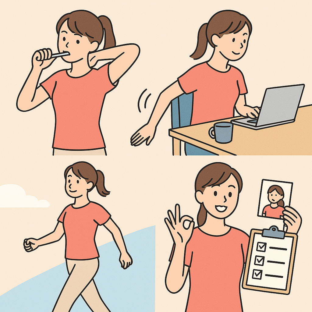 普段の生活の中でも腕の使い方を観察してみましょう。歩くときに腕を自然に振れているか、デスクワーク中に片腕だけ前に出ていないかなどを確認します。もし片方の腕だけが前に出やすい、または肩が上がっている状態が続く場合、肩甲骨の動きが制限されていることが考えられます。